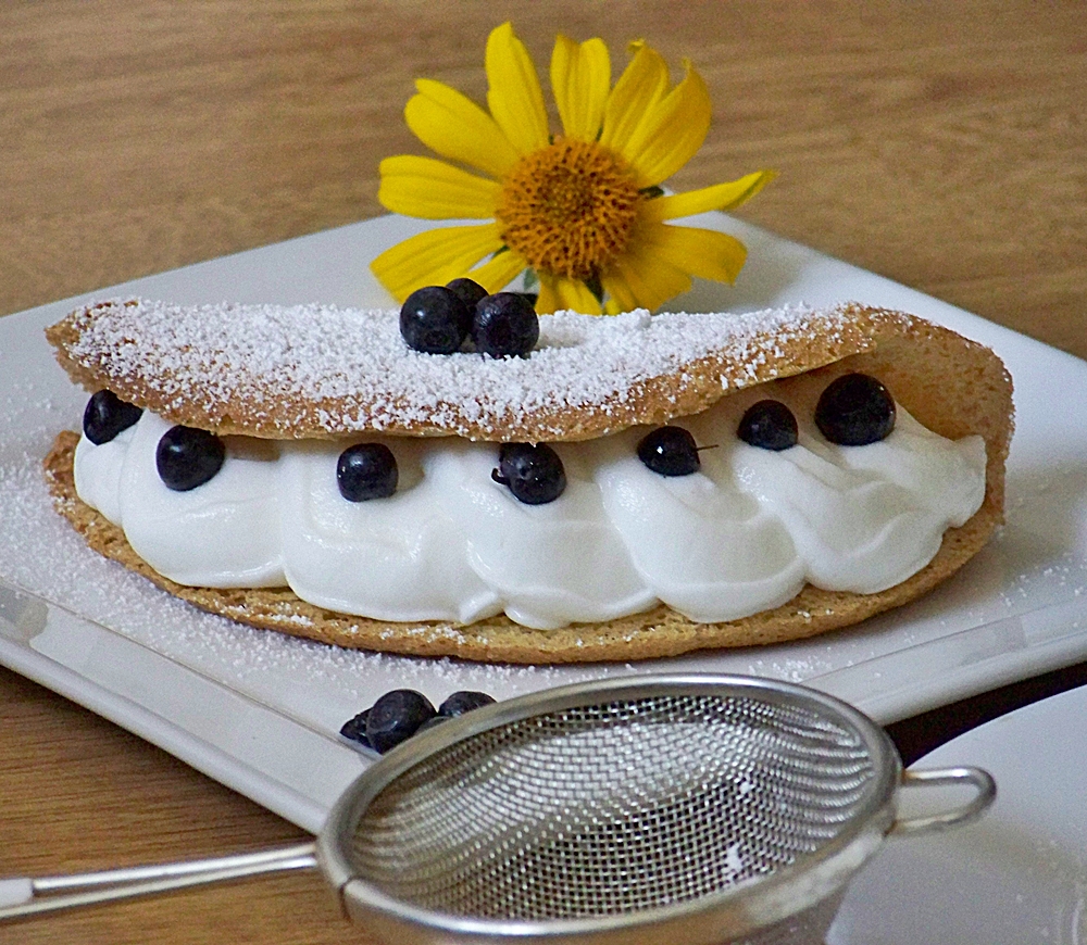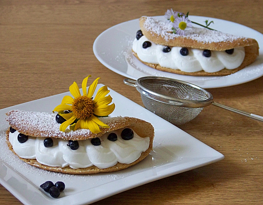 Krem: Śmietanę kremówkę ubić na sztywno, dodać cukier puder oraz mascarpone i dobrze zmiksować. Na połowie ostudzonego placuszka ozdobną końcówką wycisnąć krem. Posypać jagodami i delikatnie zgiąć. Przed podaniem oprószyć cukrem pudrem. Smacznego!