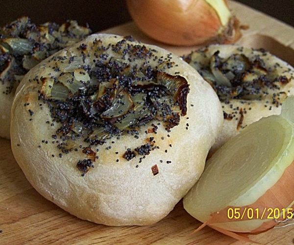 Wyrośnięte ciasto lekko zagnieść, podzielić na 8 równych części (każda po około 100 g) Uformować z nich okrągłe bułeczki, następnie spłaszczyć i rozciągnąć ciasto ze środka na boki, aby po bokach powstała obwódka. Do środka nałożyć nadzienie cebulowe. Bułki umieścić na blaszce wyłożonej papierem do pieczenia. Odstawić na 30-40 minut do wyrośnięcia.