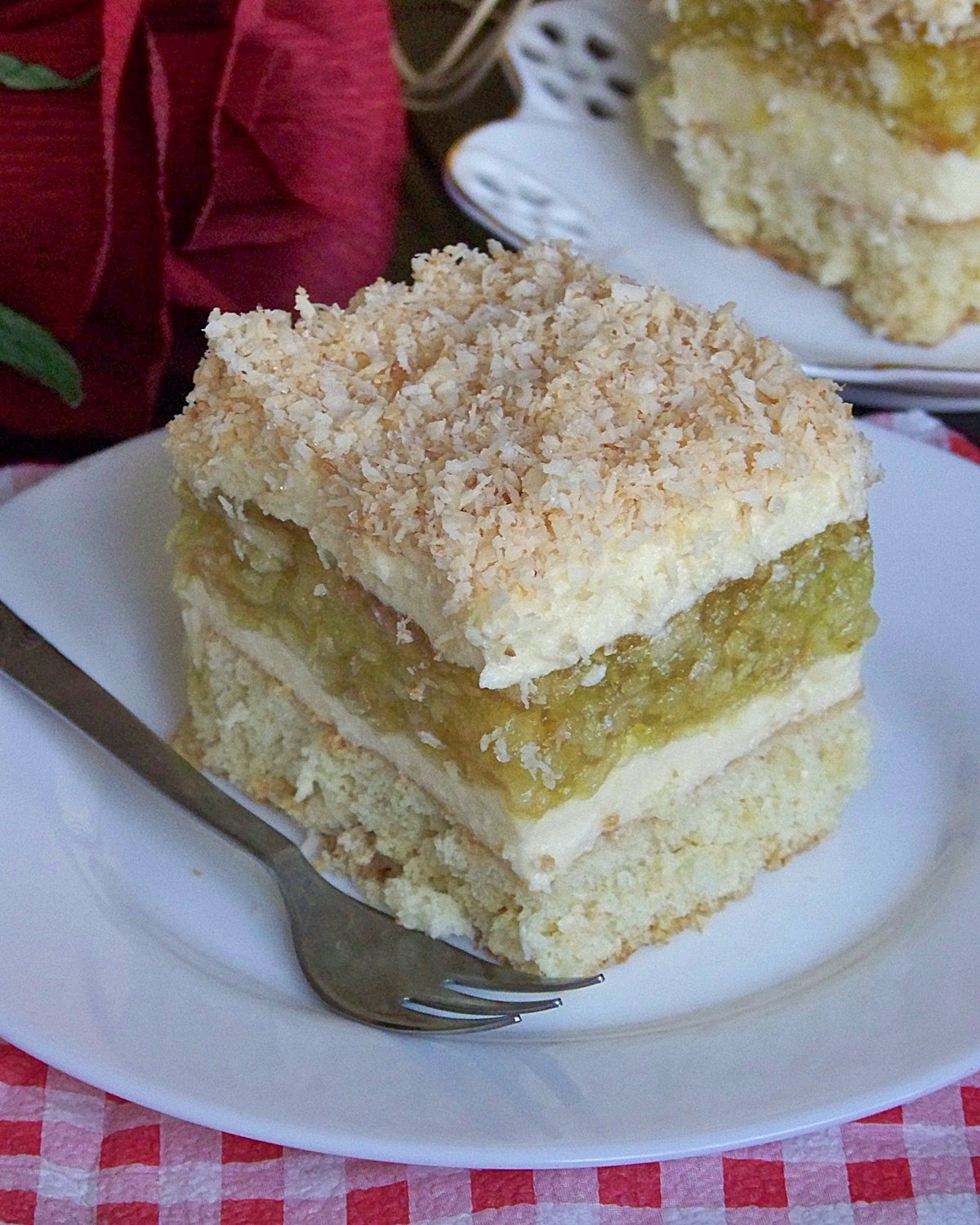 Pyszny przekładaniec składający się z puszystego biszkoptu, słodkiego kremu budyniowego, zielonej galaretki z jabłkami i podprażonego na masełku kokosu. Wszystkie te smaki doskonale się równoważą i tworzą naprawdę smaczne ciasto o dziwnej nazwie „Trociniak”. W moim domu gości on bardzo często, w szczególności na przyjęciach urodzinowych i świętach Bożego Narodzenia. Pamiętam jak jeszcze kilka lat temu to mama zajmowała się przygotowaniem tego smakołyku i dawała mi oblizywać resztki kremu budyniowego z miksera. Teraz role się odwróciły 😉