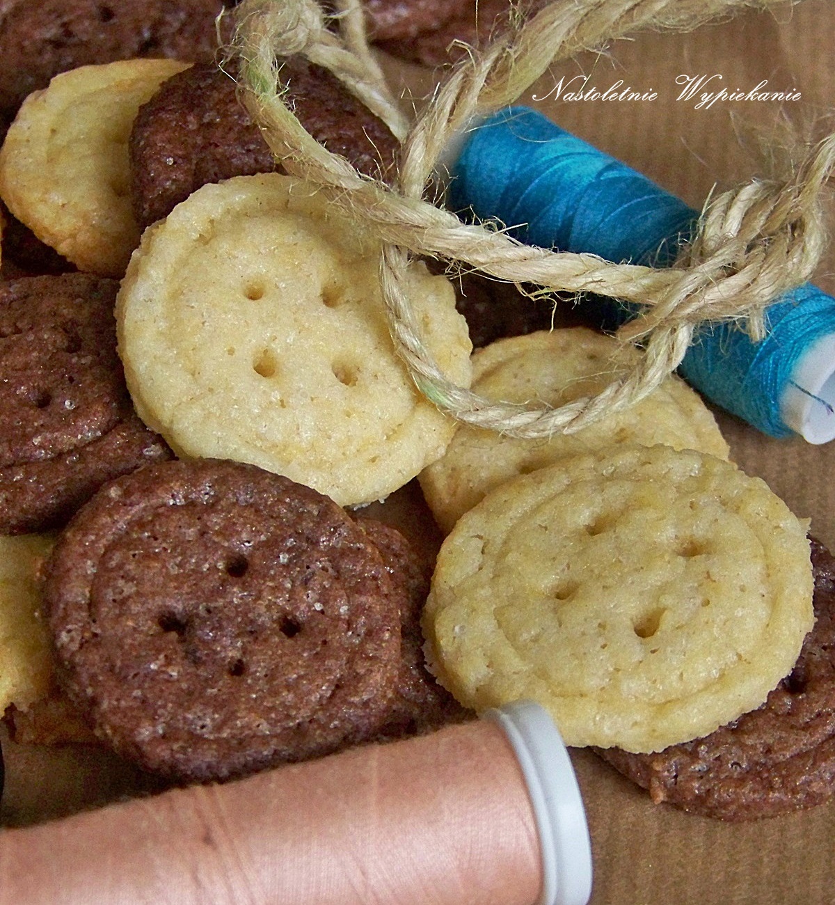 Po tym czasie ciasto rozwałkować pomiędzy dwoma arkuszami papieru do pieczenia na grubość 3-4 mm. Za pomocą kieliszka wykrawać okrągłe ciasteczka i umieszczać je na blaszce wyłożonej papierem do pieczenia. Mniejszą foremką lub kieliszkiem robić w ciastkach wgłębienia takie jak w guzikach. Za pomocą słomki lub wykałaczki zrobić dziurki.