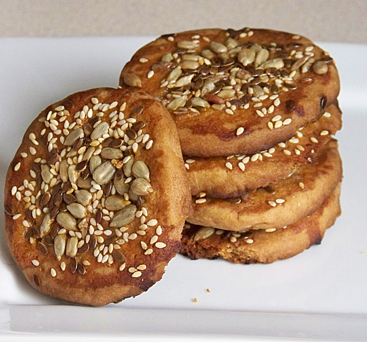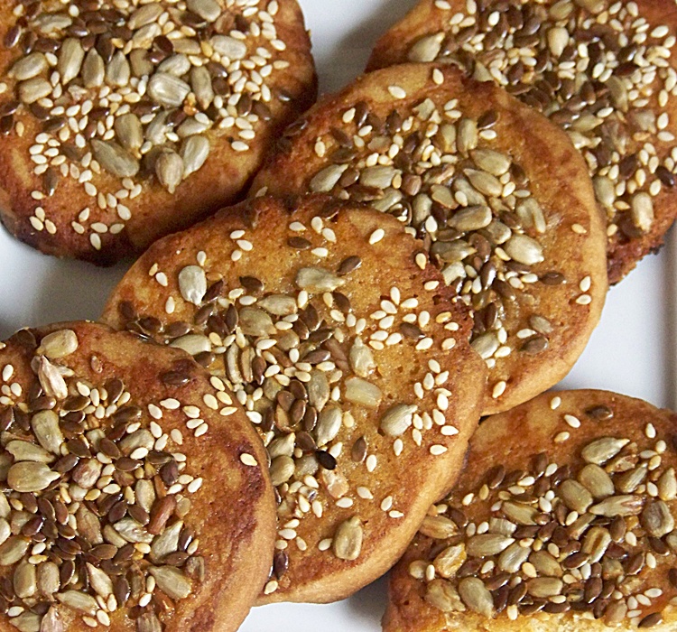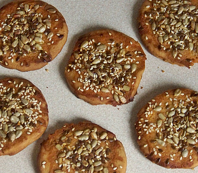 Składniki na ciasto szybko zagnieść rękami do uzyskania jednolitej masy. Uformować w kulę i owinąć folią spożywczą. Schłodzić minimum 60 minut w lodówce. Po tym czasie ciasto rozwałkować na grubość 3-4 mm i za pomocą szklanki wykrawać okrągłe ciasteczka. Umieścić je na blaszce wyłożonej papierem do pieczenia. Wysmarować miodem i obficie posypać ziarnami. Piec w 180 st.C przez około 15 minut do zarumienienia. Gdy poczujecie piękny zapach wydobywający się z piekarnika, to to jest właśnie ten moment, gdy ciasteczka są upieczone i należy wyjąć je z piekarnika i pozostawić do wystudzenia na kratce. Smacznego!