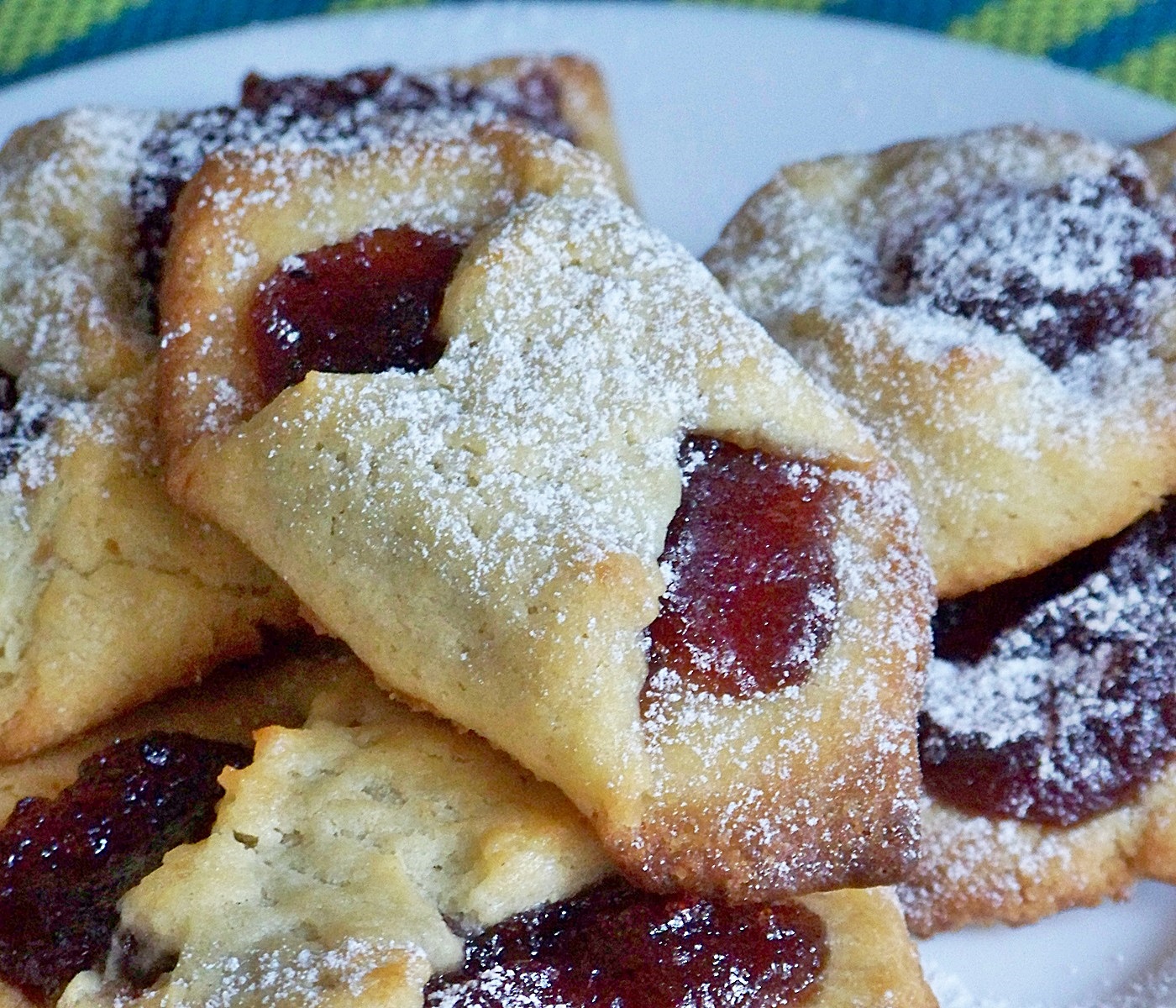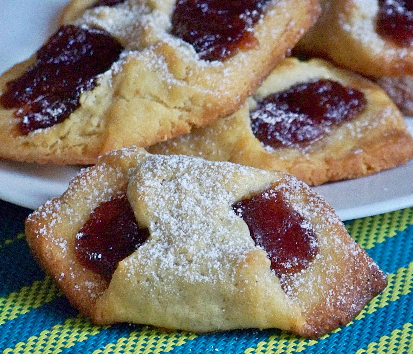 Wszystkie składniki szybko zagnieść rękami, uformować w kulę i owinąć w folię spożywczą. Schłodzić w lodówce minimum 2 godziny (najlepiej całą noc). Po tym czasie ciasto cienko rozwałkować i za pomocą ostrego noża wykrawać kwadraty o boku 6-8 cm. Na każdy kwadracik nałożyć łyżeczkę marmolady. Dwa przeciwległe końce zlepić ze sobą. Ciastka umieścić na blaszce wyłożonej papierem do pieczenia. Piec w 180 st.C przez około 15 minut do ładnego zarumienienia. Upieczone wyjąć i przestudzić na kratce. Przed podaniem posypać cukrem pudrem. Smacznego!