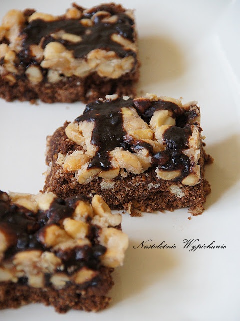Gęstniejącą polewę wylać na orzeszki w karmelu. Odstawić do zastygnięcia. Przed podaniem pokroić ostrym nożem na kwadraty. Smacznego!