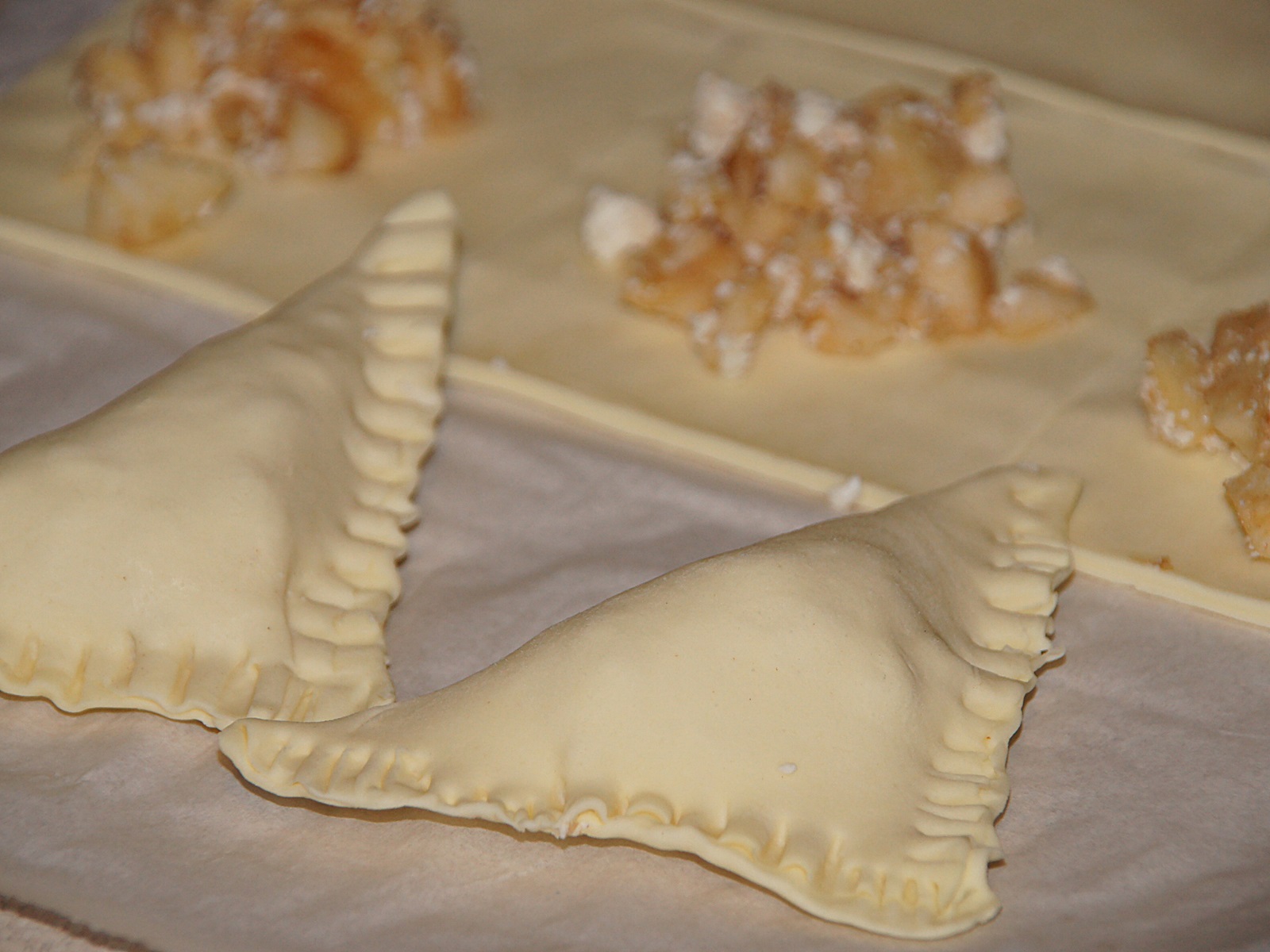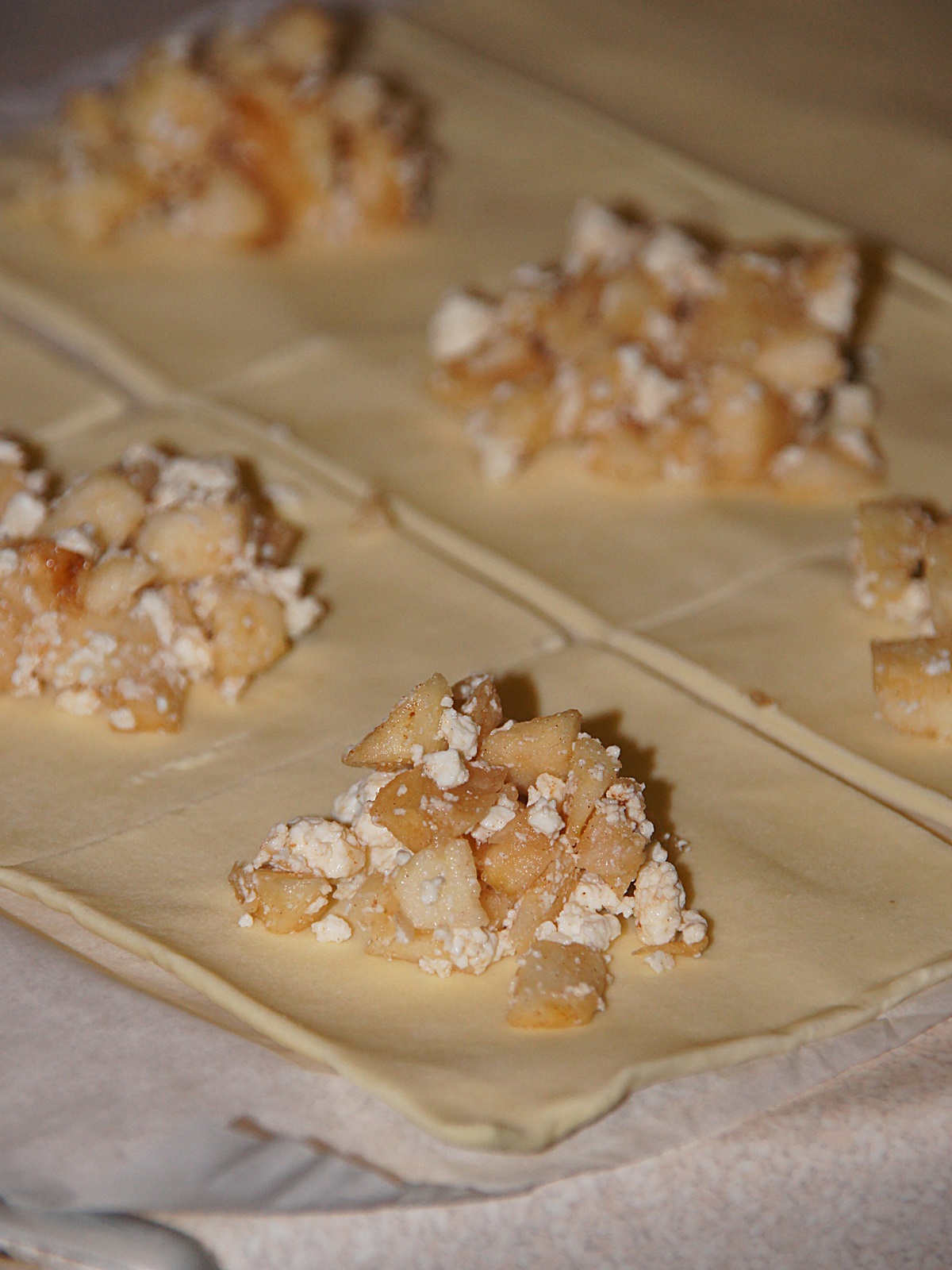 Ciasto francuskie podzielić na 12 równych kwadratów. Na każdy wyłożyć po łyżce nadzienia jabłkowego. Rogi skleić ze sobą, formując trójkąt. Każdy trójkącik przenieść na blaszkę wyłożoną papierem do pieczenia i ponakłuwać kilka razy widelcem, by różki nie urosło zbyt mocno.