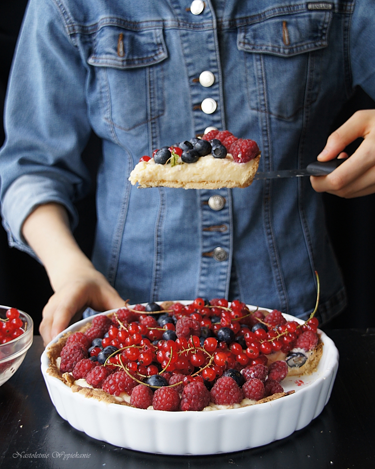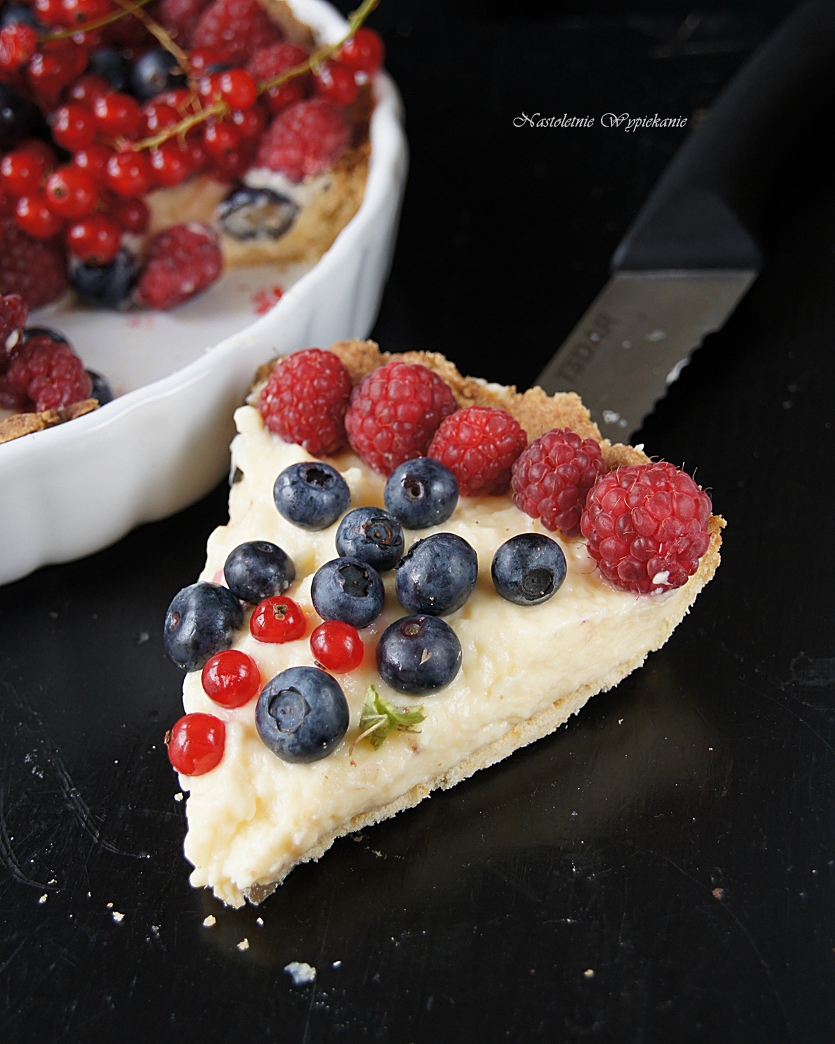 Wystudzony krem wyłożyć na upieczony kruchy spód. Na wierzch tarty ułożyć leśne owoce. Tartę schłodzić w lodówce, aż krem będzie się dobrze kroił. Smacznego!