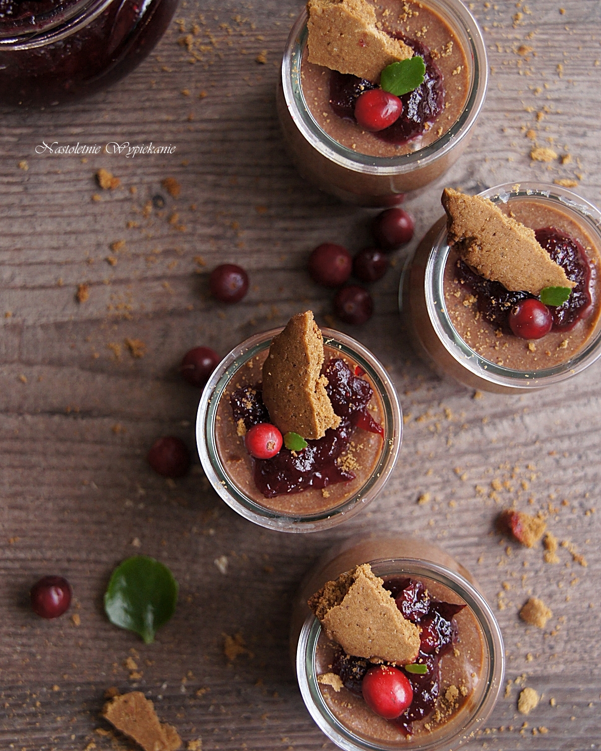 Mus czekoladowy z awokado podany w małych słoiczkach, przełożony pokruszonymi pierniczkami, a dla urozmaicenia z niewielkim dodatkiem kwaśnej konfitury żurawinowej (oczywiście domowej roboty– ze świeżej żurawinki). Pokusa dla małych i wielkim! Wypróbujcie :).