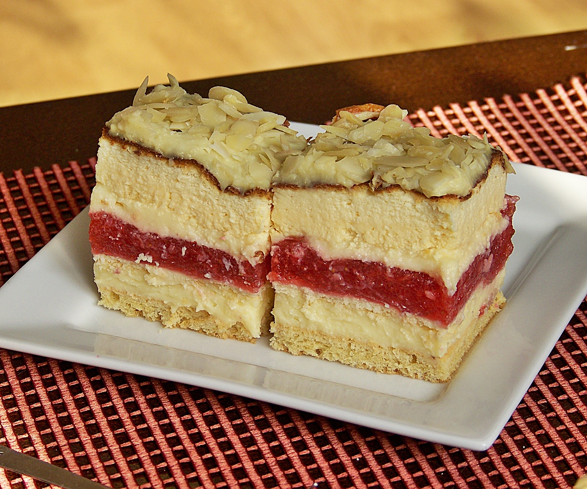 Wysoki sernik na jasnym biszkopcie przełożony masą owocową, kremem budyniowym i obsypany płatkami migdałowymi. Nie należy do tych „szybkich” w przygotowaniu, ale warto…